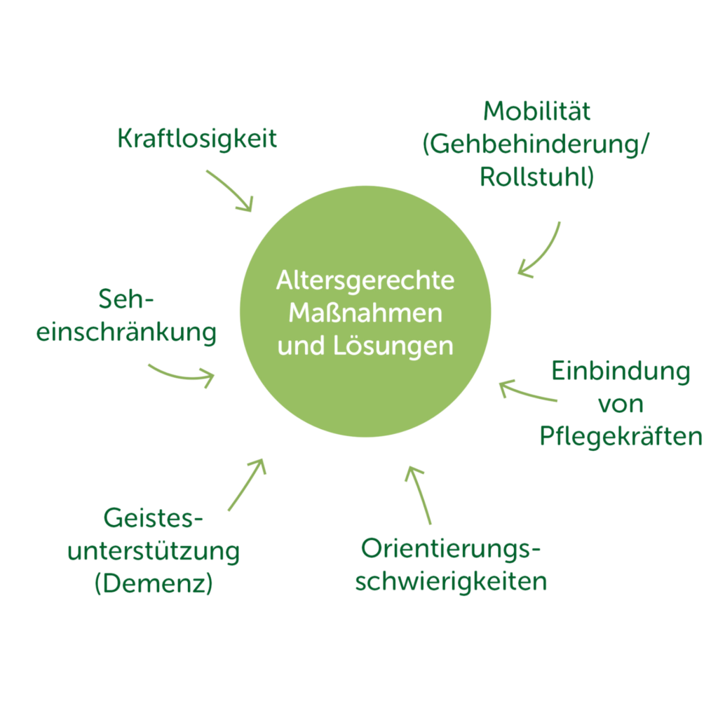 Unser intelligentes modulares Konzept bietet viele Möglichkeiten alle Risiken zu minimieren und die verminderten geistigen und körperlichen Fähigkeiten auszugleichen. Diese Punkte werden von Beginn an eingeplant und können dann bei Bedarf leichter und kostengünstiger umgesetzt werden.