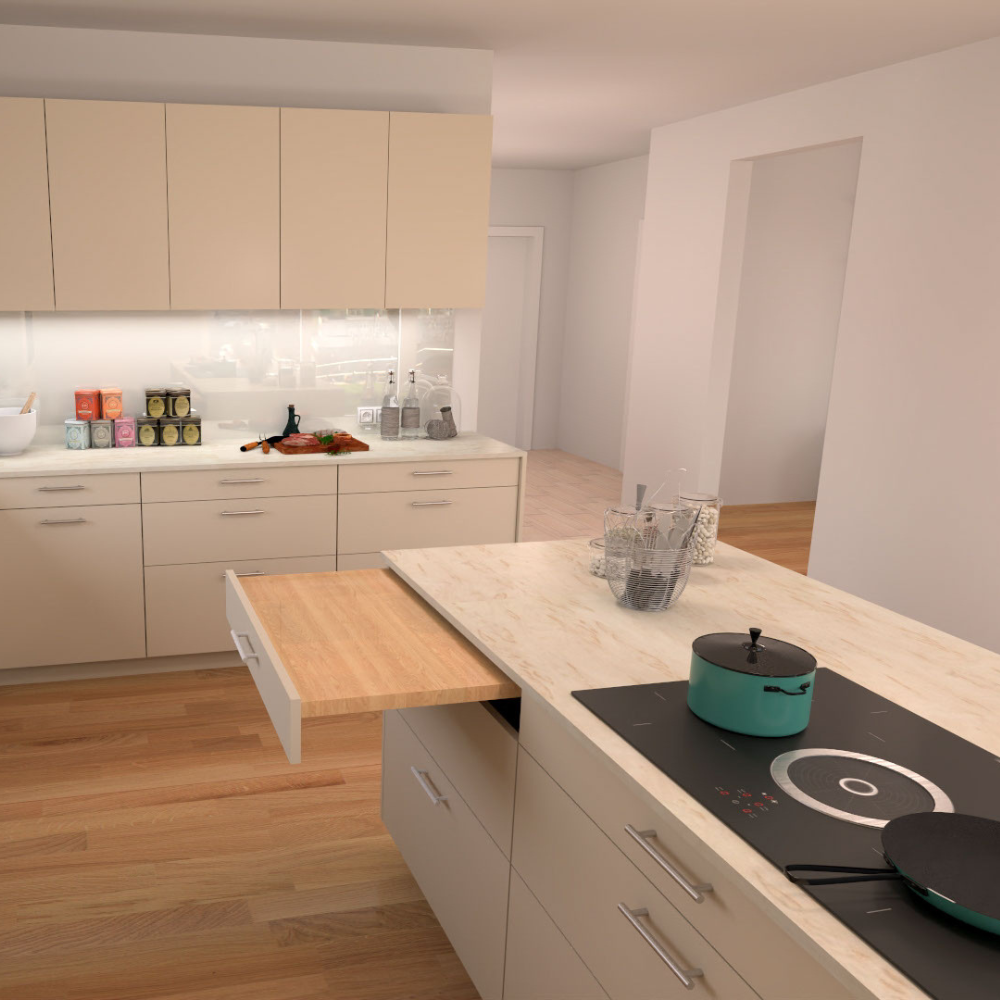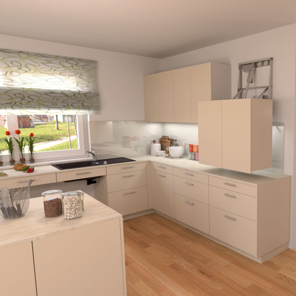 In der Küche wird Sicherheit großgeschrieben: Eine Abschaltautomatik am Herd verhindert Küchenbrände, Überlaufschutz und Wasserstop vermeiden Wasserschäden. Rollcontainer sorgen für ein stimmiges Bild und ermöglichen es die Arbeitsflächen und Spülen zu unterfahren. Durch elektrisch verstellbare Oberschränke werden keine Aufstiegshilfen benötigt und so können Stürze vermieden werden.